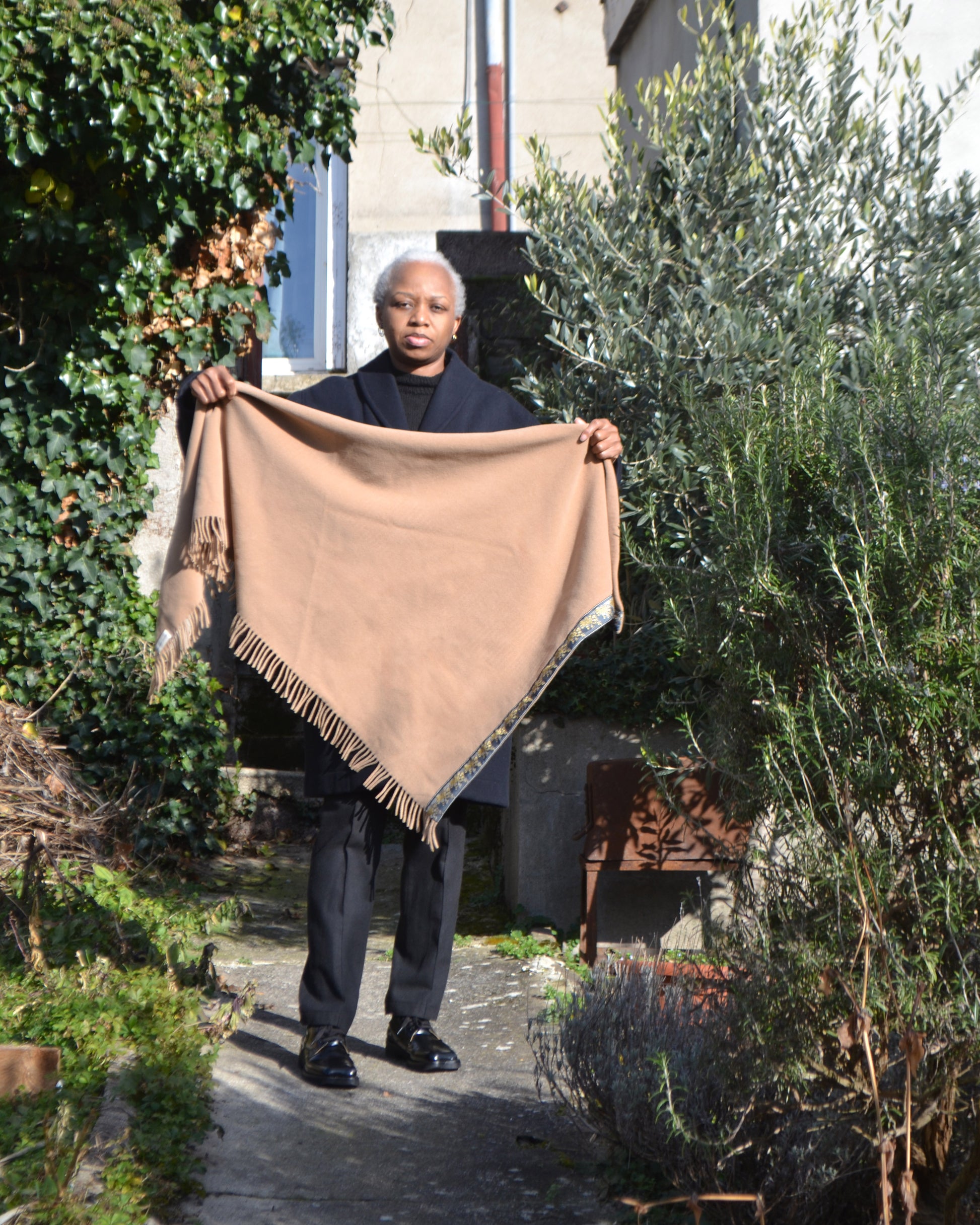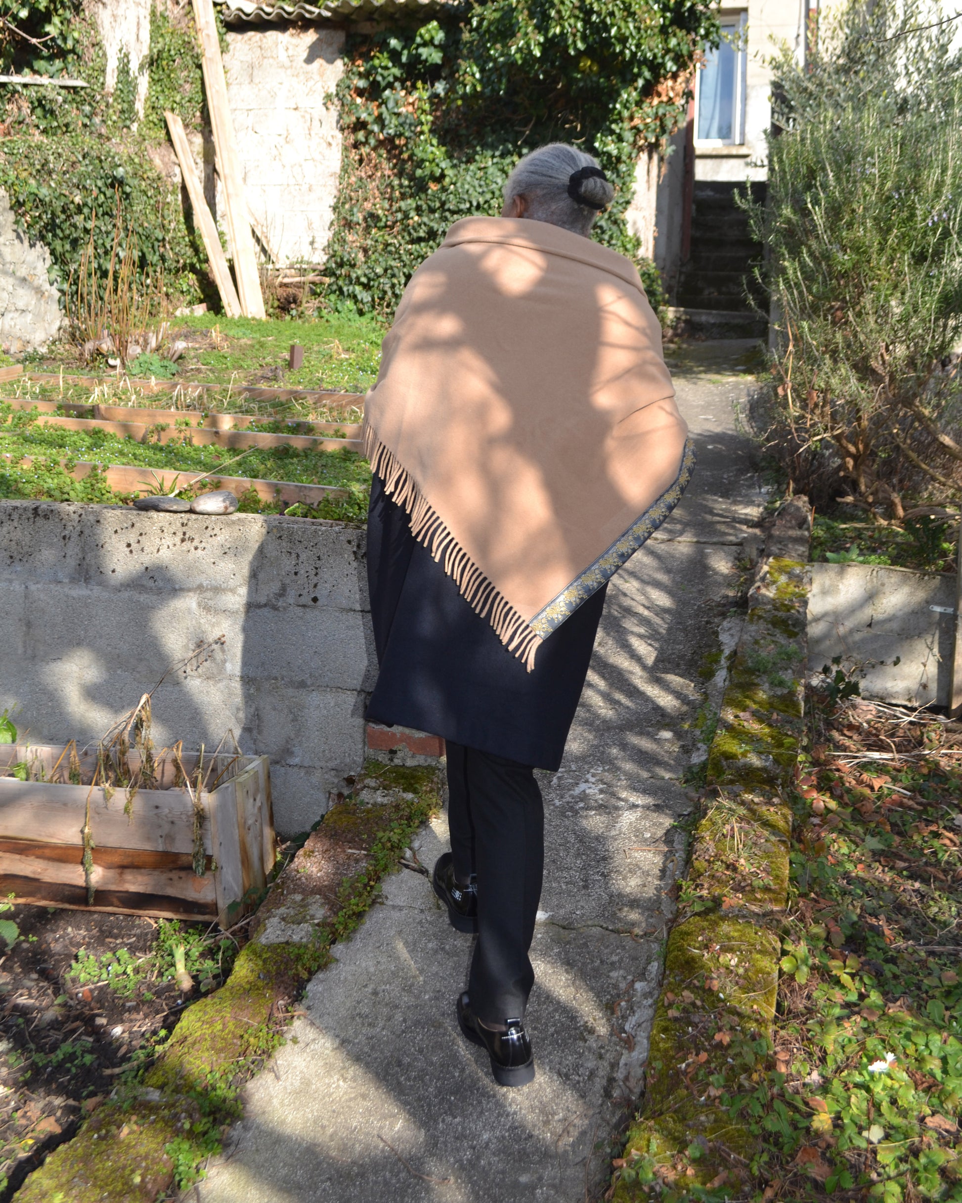 Grand châle asymétrique en laine et polyamide, doux et léger à franges. Galon Haute Couture et ourlet à la main. Une pièce enveloppante et élégante, pensée pour accompagner le geste.