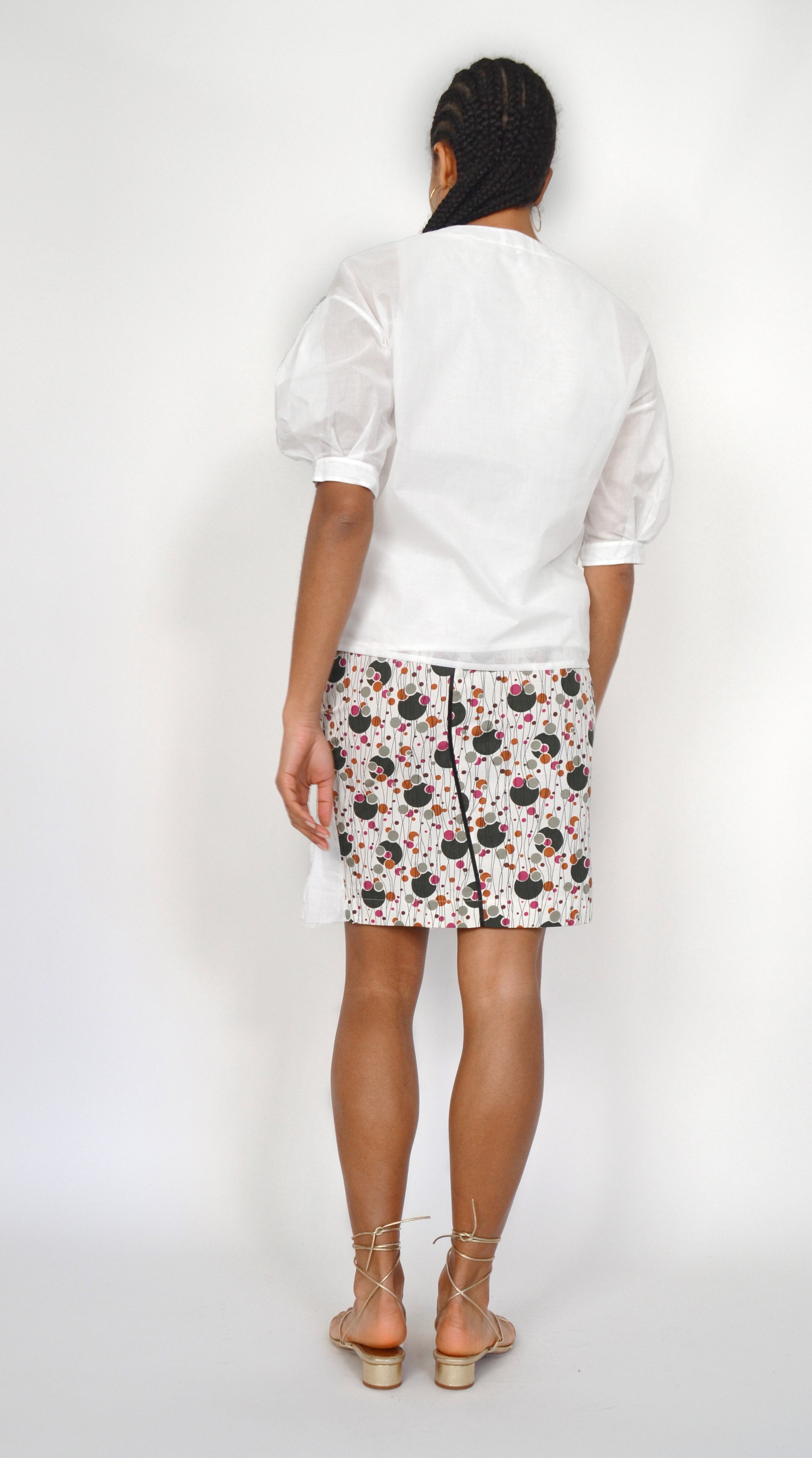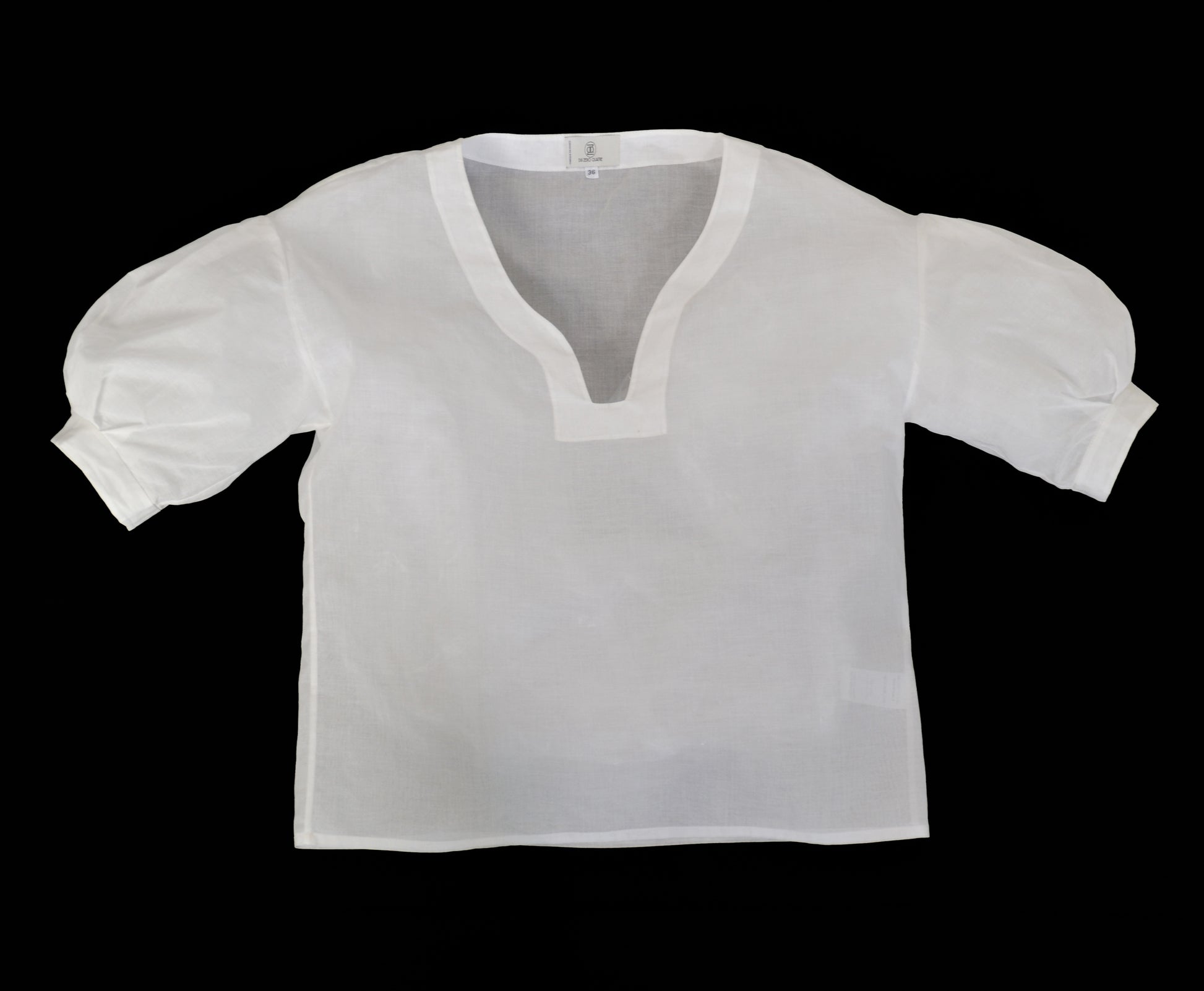 L’organdi, ce voile de coton dont l’apprêt le rend assez rigide pour permettre de réaliser des volumes tout en légèreté. C’est le cas pour ce haut dont les manches ballon sont réalisées uniquement grâce à un pli creux et quelques fronces. Son décolleté asymétrique apporte une touche raffinée et originale.