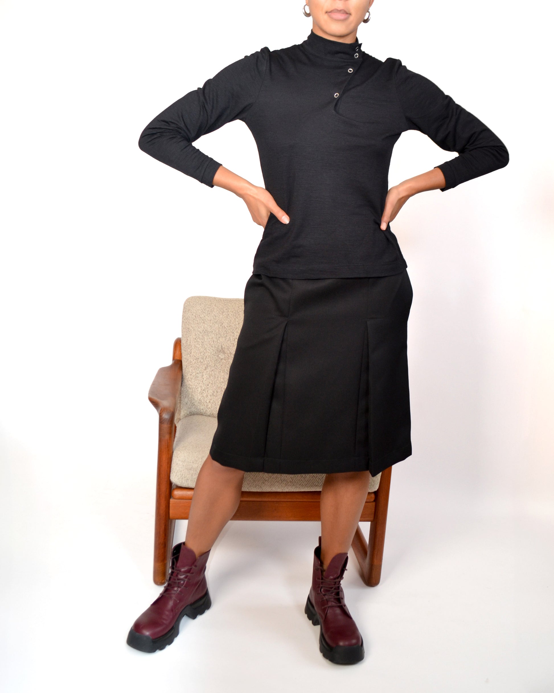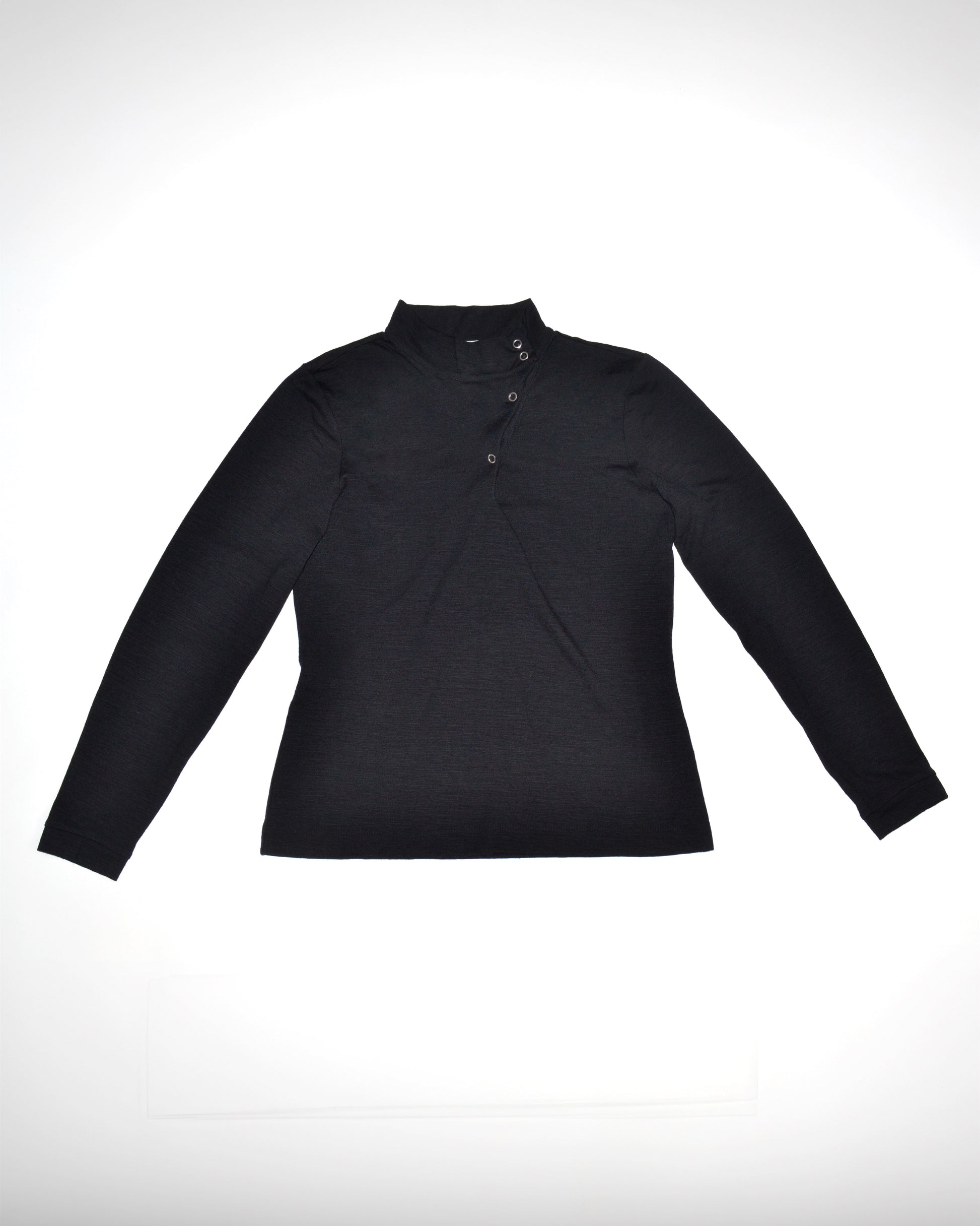 Top à col montant, confectionné dans un jersey de laine à la texture douce et raffinée. Son style polyvalent avec une coupe ajustée est complété par une ligne inclinée de boutons pression qui remonte jusqu’au col. Un essentiel à avoir dans une garde-robe.